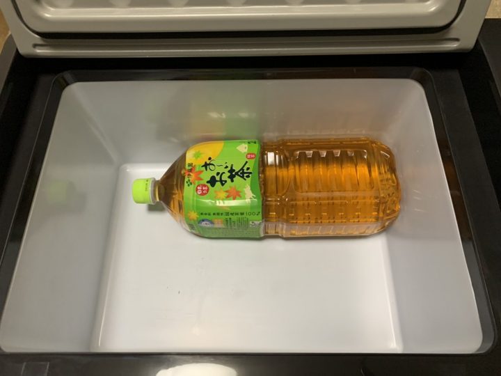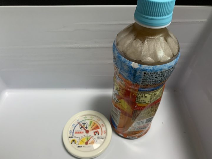 この温度まで下がったところで、設定温度を-10℃に設定して、一晩置いておいた結果がこれです。しっかりとペットボトルが凍っているのが確認できます。